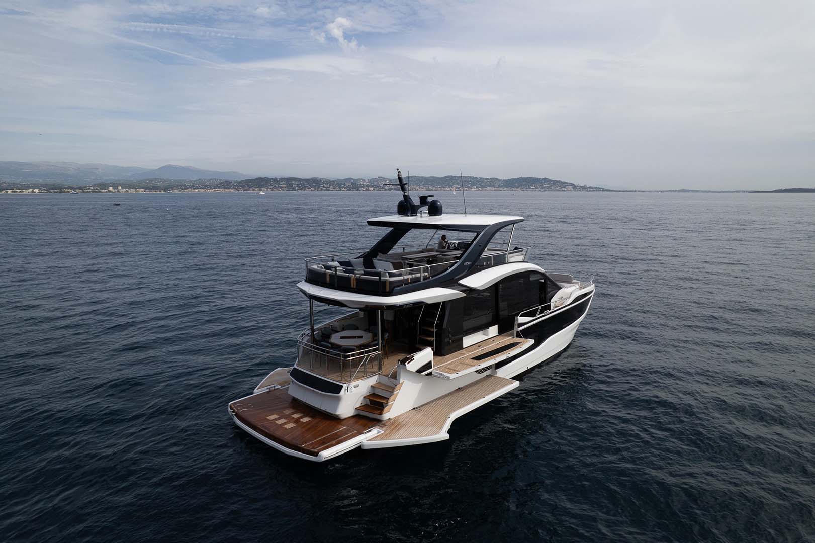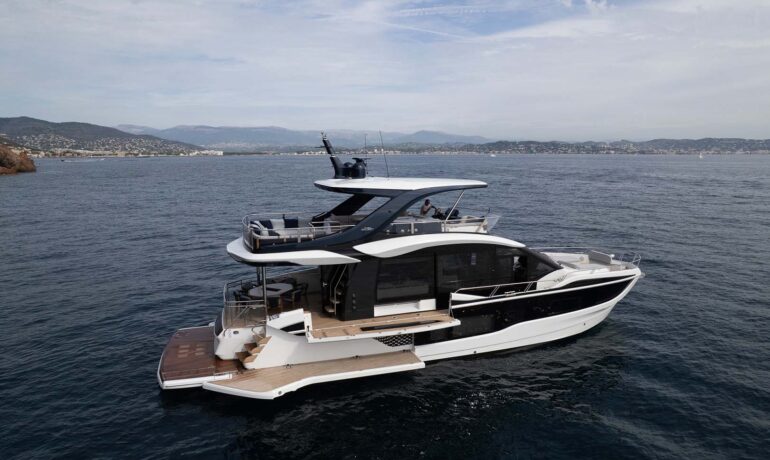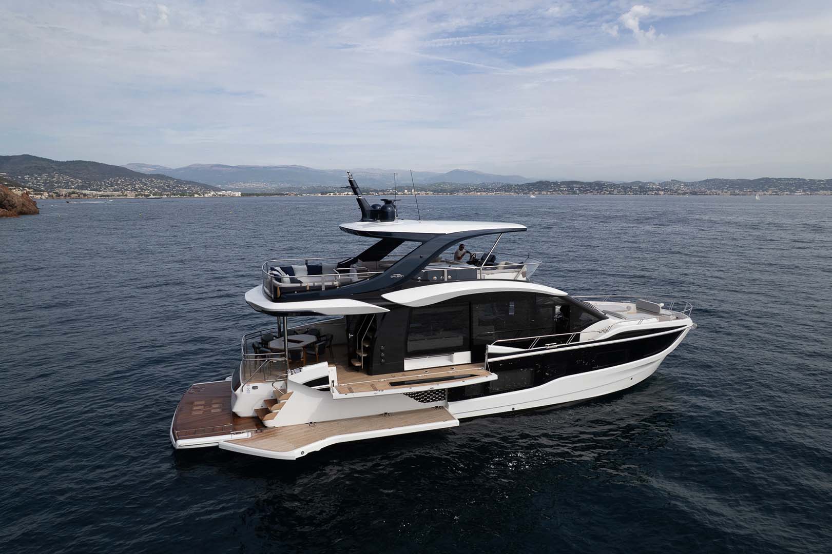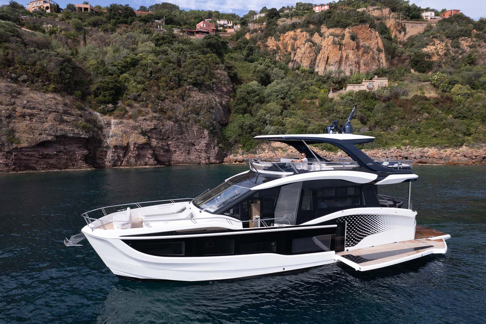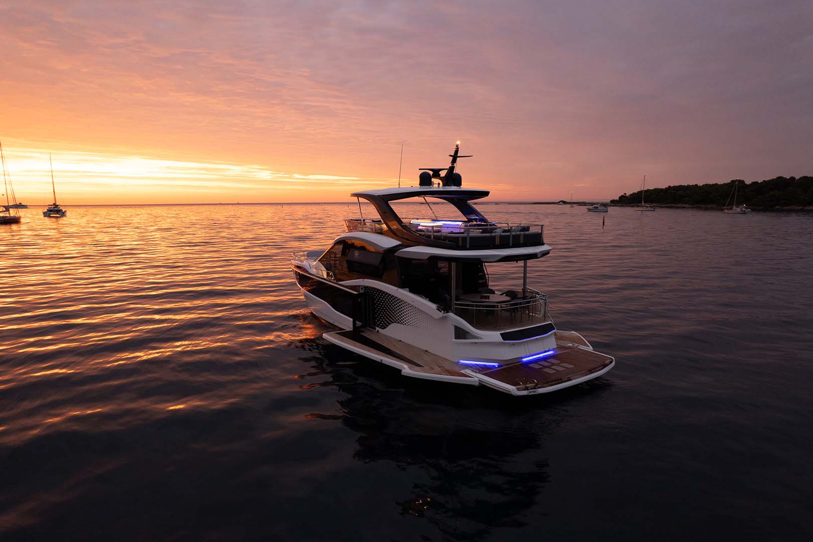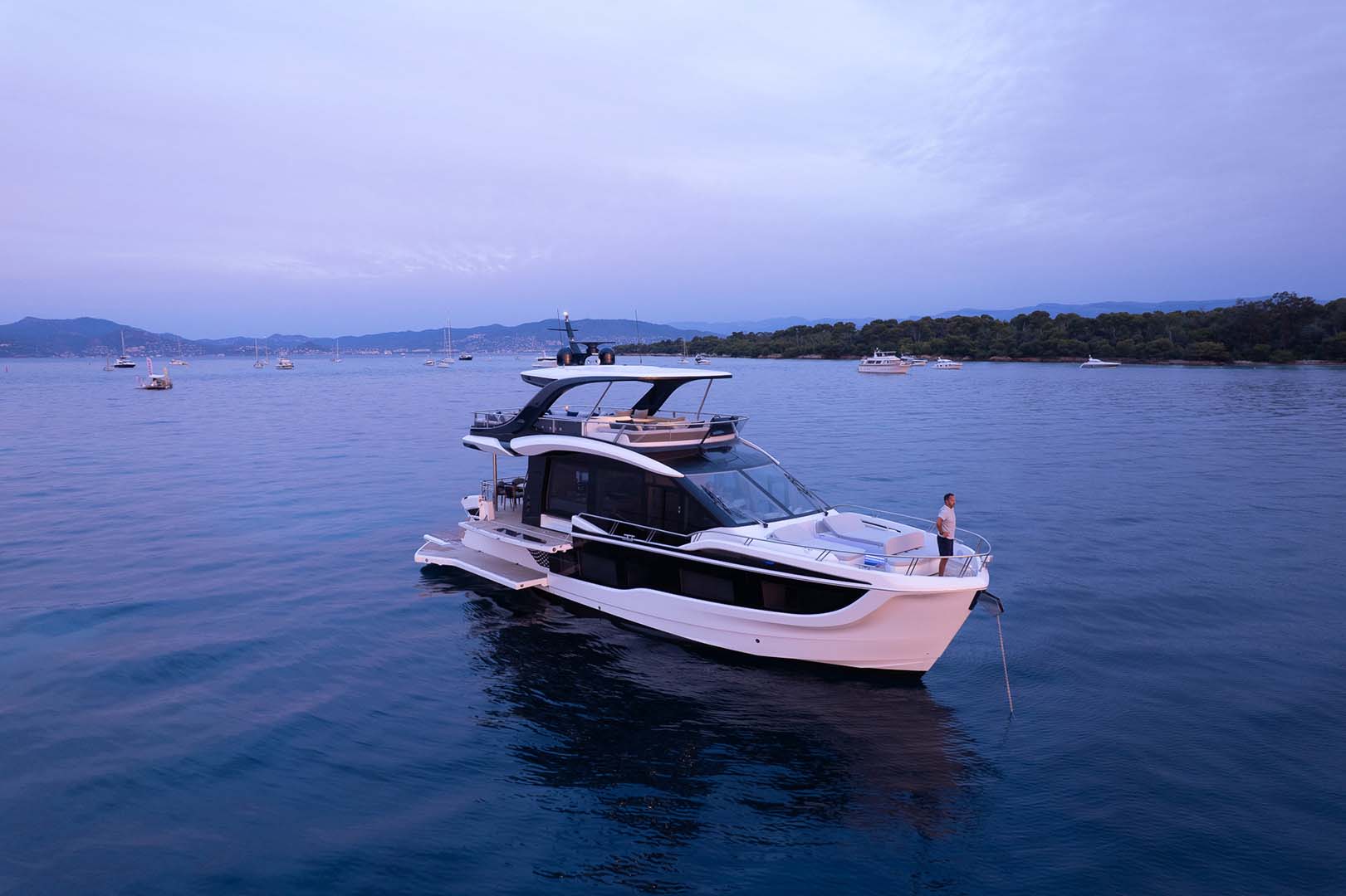 The Galeon 620 FLY is a bold statement in modern yacht design, combining dynamic styling with groundbreaking innovation and spacious comfort. Its asymmetrical main deck maximizes usable space and flow, while Beach Mode balconies and panoramic glazing create an extraordinary connection to the sea. Themaster cabin offers direct private access to the water, enhancing the onboard experience. As the first Galeon to collaborate with 3G Acoustics Studio, the 620 FLY delivers immersive, high-fidelity sound without visible speakers – achieving audio perfection without compromising design. With a luxurious, customizable interior crafted by a top design studio, this flagship redefines what’s possible in the 60-foot class. 620 FLY has been awarded the BEST INNOVATION AWARD at Cannes Yachting Festival 2025!